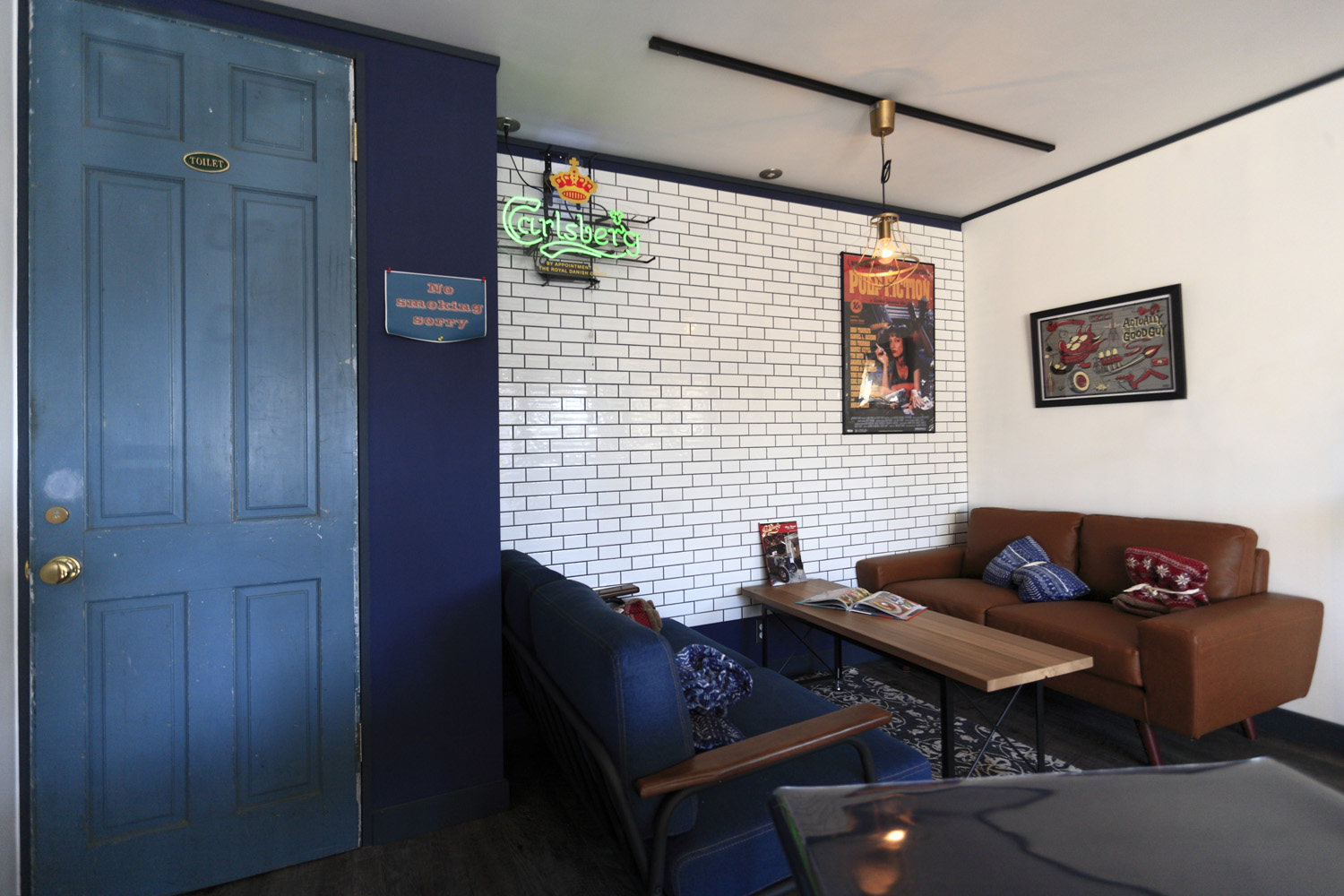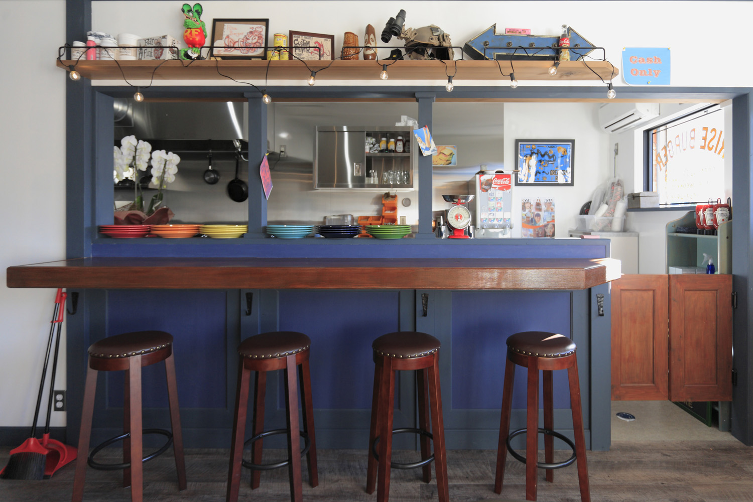 1960年代のアメリカ製玄関扉&トイレ扉を最初に決定し、それを元に内外装のインテリアカラーを白・紺・茶をメインにし、